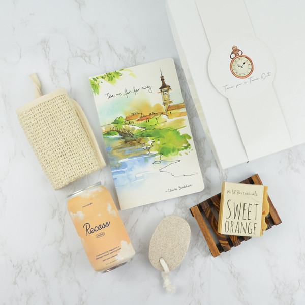Product Overview It is absolutely time for a time out! Sit back and relax with this curated gift set that includes a Recess Blood Orange beverage, sweet orange soap bar with wooden tray, a sisal cloth, pumice stone and a gorgeous journal.